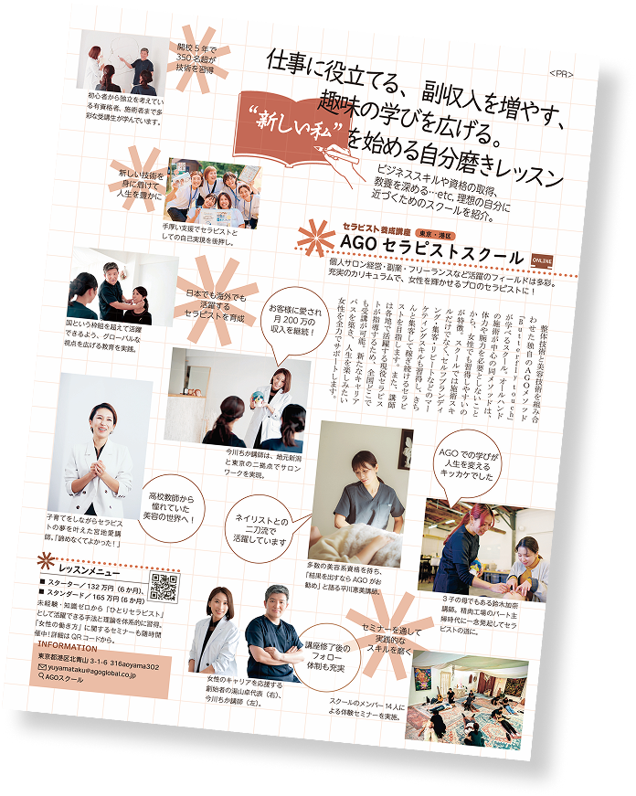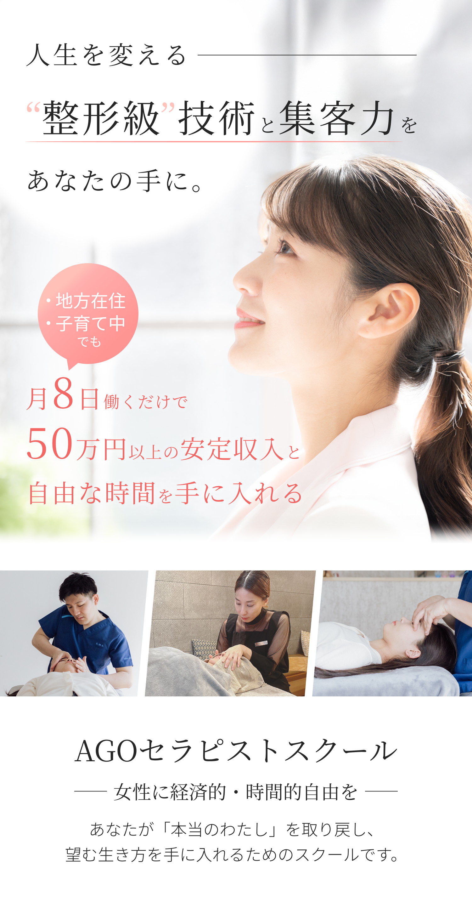 A:AGOは「技術だけでなく、ビジネスとして成功するためのノウハウ」を重視しています。 資格取得がゴールではなく、独立開業して “稼ぎ続ける”仕組みづくりに投資いただく価値があります。