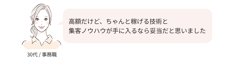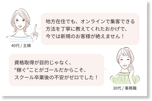 施術だけでなく、ブランディングやSNSマーケティングなども学ぶため、顧客が途切れにくく、安定した収入を維持。